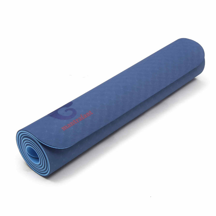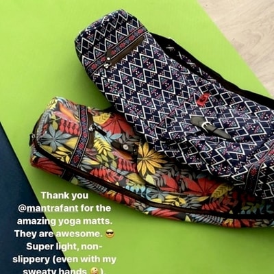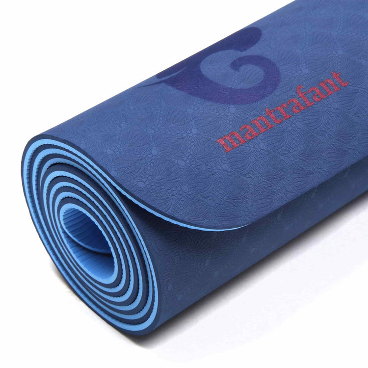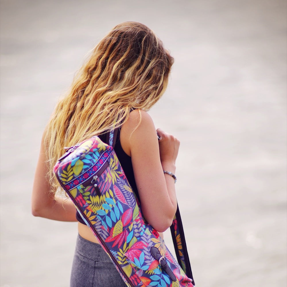 Deine rutschfeste mantrafant in der Bhakti-Collection (limitierte Auflage) besteht aus der blauen mantrafant Yogamatte und der bunten Yogatasche.